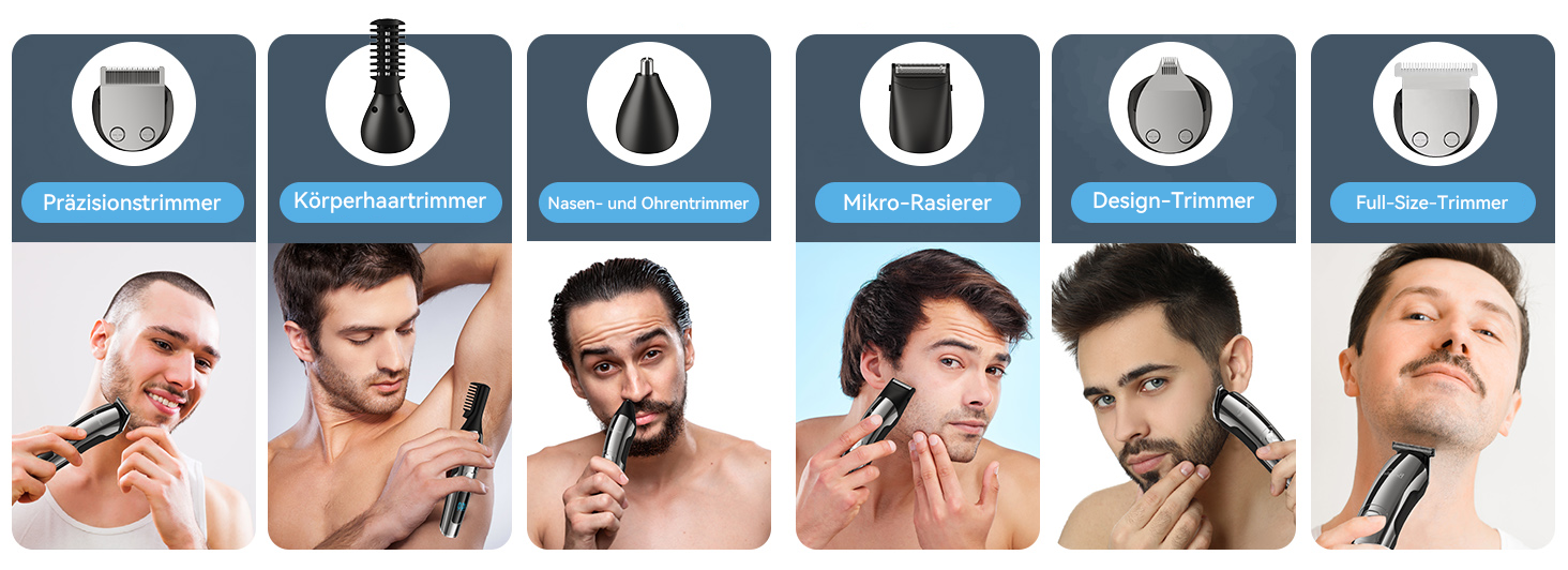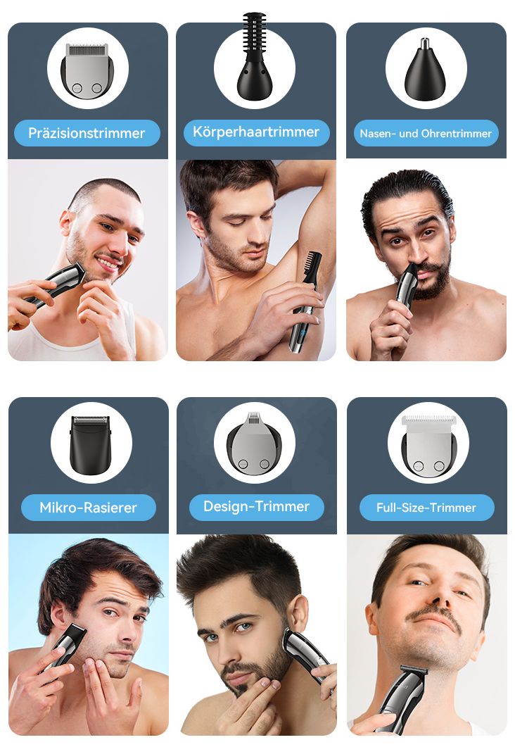 Verabschiede dich von überladenen Arbeitsflächen und einer Schublade voller Werkzeuge! Dieses multifunktionale Pflegeset ist dein kompletter persönlicher Stylist, der für eine umfassende Auffrischung deines Looks entwickelt wurde. Es ist nicht nur ein einfacher Haarschneider – mit sechs professionellen, austauschbaren Köpfen erfüllt er präzise jedes deiner Pflegebedürfnisse: U-Klinge, T-Klinge, Gravurklinge, Folienrasierer, Nasen- & Ohrenhaarschneider, Bodygroomer.